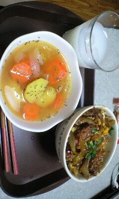 もはや定番のオリジナル?ポトフと惣菜の鳥の唐揚げの卵とじ丼